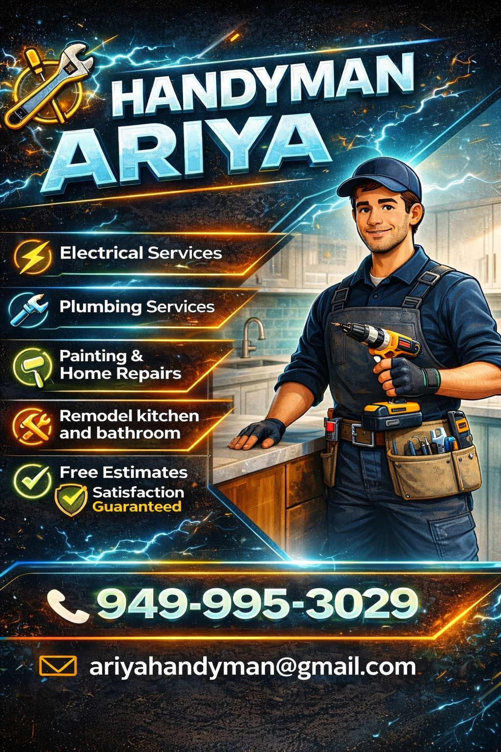 Handyman, whole house electrical, TV Mounting, switch and outlet replacement, adding plugs, home electrical troubleshooting replacement, kitchen handyman, electrician,lighting, overhaul cabinet door,cabinet lighting, GFCI replacement, recessed and halogen lighting and installation, yard lighting, fan repair and replacement, 120V to 240V conversion for washing machines and car chargers, sink repair and replacement, toilet repair and replacement, interior painting, drywall replacement and repair, cabinet door adjustment and cabinet door installation,fixtures (bed, bookcase, TV stand,etc)